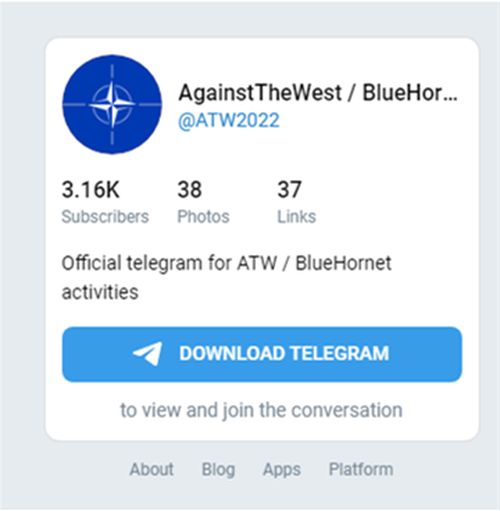 2021年10月,ATW组织开始频繁活动,不断在电报群组(https://t.me/s/ATW2022,Email:AgainstTheWest@riseup.net,备份Email:apt49@riseup.net)、推特(@_AgainstTheWest,https://mobile.twitter.com/_AgainstTheWest)、Breadched(账号:AgainstTheWest)等境外社交平台开设新账号,扩大宣传途径,并表现出较明显的亲美西方政治倾向,多次声明“攻击目标是俄罗斯、白俄罗斯和中国、伊朗、朝鲜”、“愿意与美国、欧盟政府共享所有文件”、“愿受雇于相关机构”。