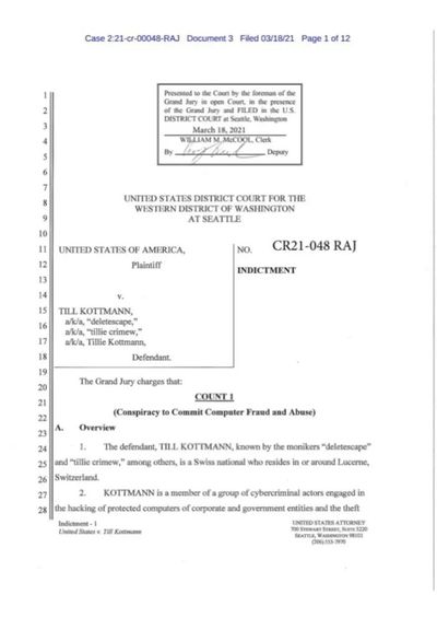 美国司法部对蒂莉·考特曼的起诉书及公布照片