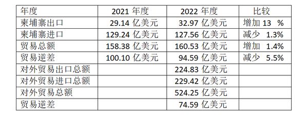 而柬埔寨国家对东盟国家的出口,在2021年时为29.14亿美元,2022年时这出口增加到32.97亿美元,增幅为13%。对东盟出口占对外出口总额224.83亿美元的14.7%。另外,2021年时柬埔寨由东盟国家进口129.24亿美元,2022年时这进口为127.56亿美元,下降1.3%,占进口总额299.42亿美元的42.6%。