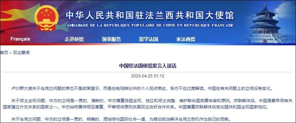 据中国驻法国大使馆网站4月25日消息,卢沙野大使关于乌克兰问题的表态不是政策宣示,而是在电视辩论中的个人观点表达,各方不应过度解读。……