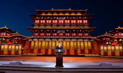 习近平夫妇为贵宾举行唐朝传统迎宾仪式。紫云楼前,礼乐和鸣,明快有力的古代佾舞、绚丽婀娜的芙蓉花舞,表达了古都西安人民的热情好客,体现了中华文化兼容并蓄的精神风貌。