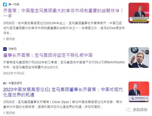 宝马集团董事长齐普策在今年4月的活动上表示,“中国是宝马最大的单一市场,宝马参与并支持中国汽车行业的发展,致力于成为中国迈向现代化征程的同路人”、“宝马对中国的信心从未动摇过”、“慕尼黑是我们出生的地方,但中国是宝马的家。”