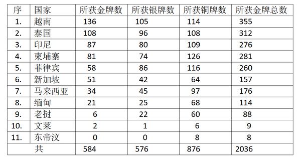 第32届东南亚运动会于5月17日在柬埔寨国家首都金边市举行了闭幕典礼。本届运动会中,越南国家不论在金牌数还是奖牌总数上都位居第一。本来越南国家体育代表团在本届东运会(SEA GAME)上原预定的目标是,夺取金牌90到120枚,奖牌总数争取进入前三名。现在运动会结束,越南金牌数为136枚,奖牌总数位居第一,超过了预期的成绩。而且金牌总数还领先位居第二的泰国队20多枚,稳坐东盟体育强国的第一把交椅了。而泰国队以108金96银108铜的成绩位居第二,印尼体育代表团以87金80银109铜位居第三,东道主柬埔寨则排名第四。参与比赛的东南亚诸国的名次及其等所获的奖牌数如下: