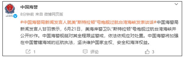 中国海警局新闻发言人甘羽表示,6月21日,美海岸警卫队“斯特拉顿”号炮舰过航台湾海峡并公开炒作。中国海警舰艇对其全程跟监警戒,依法依规应对处置。中国海警将加强在中国管辖海域的巡航执法,坚决维护国家主权、安全和海洋权益。