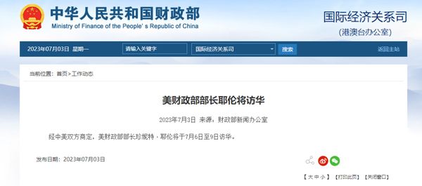 财政部网站7月3日消息,经中美双方商定,美财政部部长珍妮特·耶伦将于7月6日至9日访华。