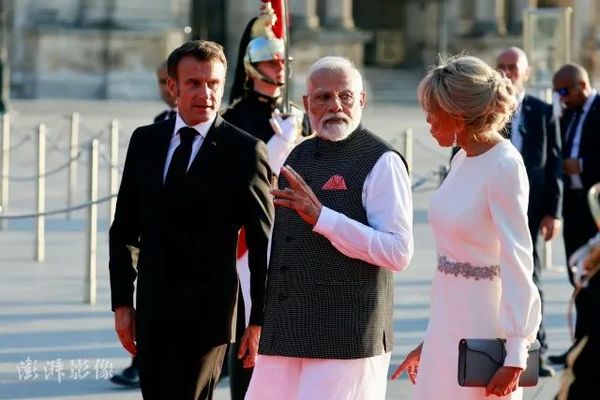 7月14日法国国庆日当天,印度总理莫迪作为主宾国元首同法国总统马克龙共同观看阅兵式,还被授予法国最高荣誉勋章。