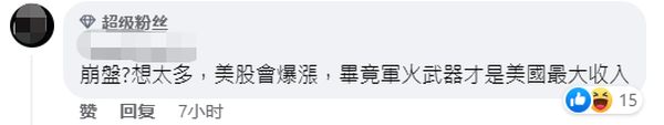 不少岛内网民直言,郭台铭有一点说得没错,很多台湾民众都不想看到战争,但郭台铭倒不用吓唬妄图“以台制华”的美方,说不定美国军工业、能源股会“涨停”,“毕竟军火武器才是美国最大收入”。