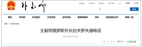 外交部网站消息,2023年8月7日,中共中央政治局委员、外交部长王毅同俄罗斯外长拉夫罗夫通电话。