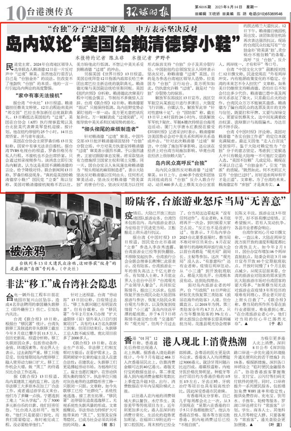 民进党主席、2024年台湾地区领导人选举候选人赖清德12日在一片反对声中“过境”窜美。虽然他在行前否认自己是“台独金孙”的说法,但改变不了他鼓吹“台独”的本质。他的一言一行引起岛内舆论的高度警惕。