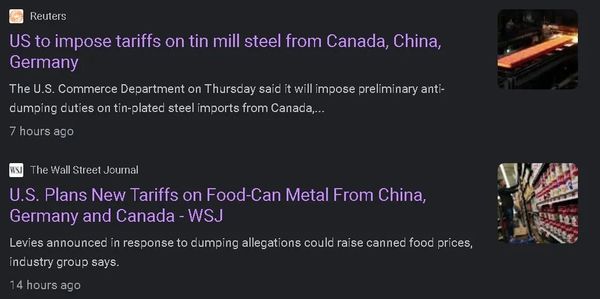 由于镀锡钢用于制造食品罐头与其他容器,有美国媒体称,这会导致一些罐头食品价格上涨。