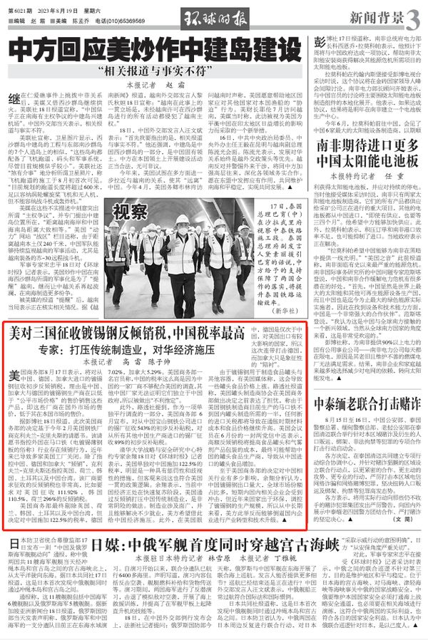 此外,路透社提到,作为一项单独平行调查的一部分,美国商务部6月宣布,对从中国宝山钢铁公司进口的锡厂征收543%的初步反补贴税,对从所有其他中国生产商进口的锡厂征收89%的初步反补贴税。