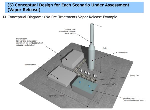 日本含氚废水特别工作组2016年6月发表核废水处置方案的评估报告表明,在综合考量技术和监管可行性这两项基本要求后,海洋排放和蒸汽释放都是可行的方案。但进一步考虑潜在的制约因素,尤其就时间和经济成本而言,海洋排放的优势最为显著。