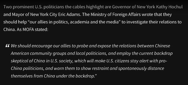 台湾当局的文件还特别提到了美国纽约州的女州长凯茜·霍楚尔(KathyHochul)和纽约市长埃里克·亚当斯(Eric Adams)。台当局要求其驻美人员通过其在美国“政坛、学术圈和媒体的盟友”去调查像他们这样的“友华”政客,迫使他们与北京“划清界限”。
