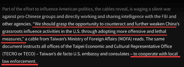 如上图所示,在这篇题为“文件显示台湾当局在与(美国)FBI合作迫害美籍华人,威胁美国政客”的文章中,MintPressNews的记者表示,他们拿到了来自台湾“外交部”发给“台北经济文化代表处”的内部文件,而在这些文件中,台湾当局要求其驻美人员采取“攻击性”乃至“致命”的手段去打击北京在美国的影响力,并与FBI等美国的执法部门合作。