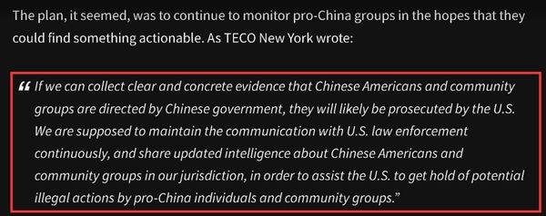 但台湾当局并没有死心,而是继续指示其驻美人员“搜集”美籍华人和华侨团体与北京的关联,并“继续保持”与美国执法部门的联系,“分享情报”,好让反对台湾或对北京友善的人能被美国政府起诉。