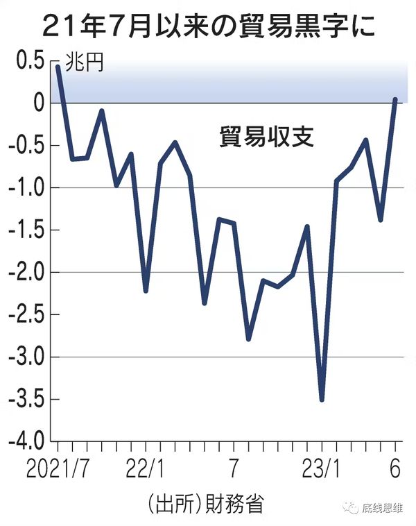 而2021年7月之后,日本就开启了日元超级贬值政策。正是靠这样的极端方式,把日元贬值了近三成,才终于在2023年6月实现了贸易顺差。