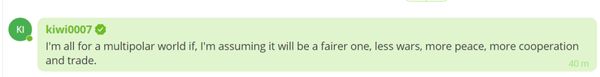 “我完全支持多极化世界,我认为这将是一个更公平的世界,是更少战争,更多和平,更多合作和贸易的世界。”