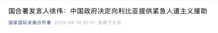2023年9月18日,国家国际发展合作署新闻发言人徐伟表示,中国政府决定向利比亚提供3000万元人民币的紧急人道主义援助,以帮助利开展飓风、洪水灾害后的救援工作。根据利方需求,中方援助物资主要有帐篷、毛毯、急救包、手压水处理设备、便携式彩色多普勒超声诊断仪等。