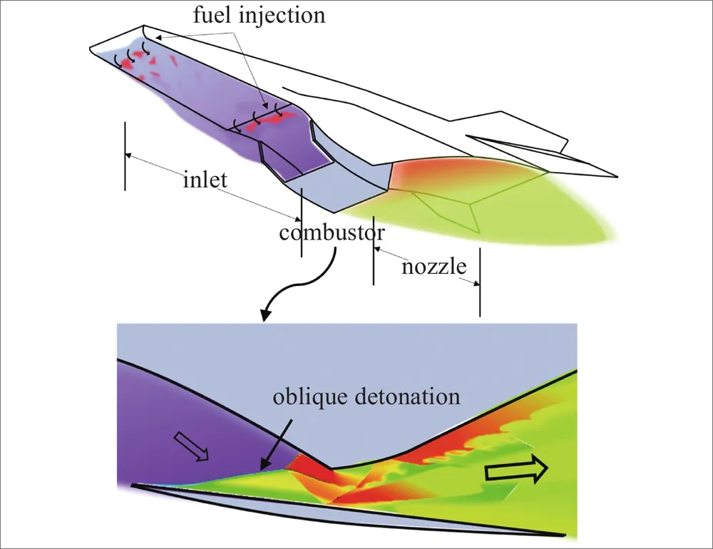 超音速燃烧冲压发动机需要庞大的燃烧室,且在高马赫数之下存在熄火的风险。而与之不同的是,斜爆震发动机发动机则将斜爆震波视为一种支撑力量。