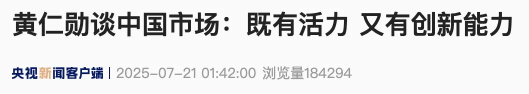 黄仁勋:中国供应链体系全球数一数二 堪称世界级的奇迹