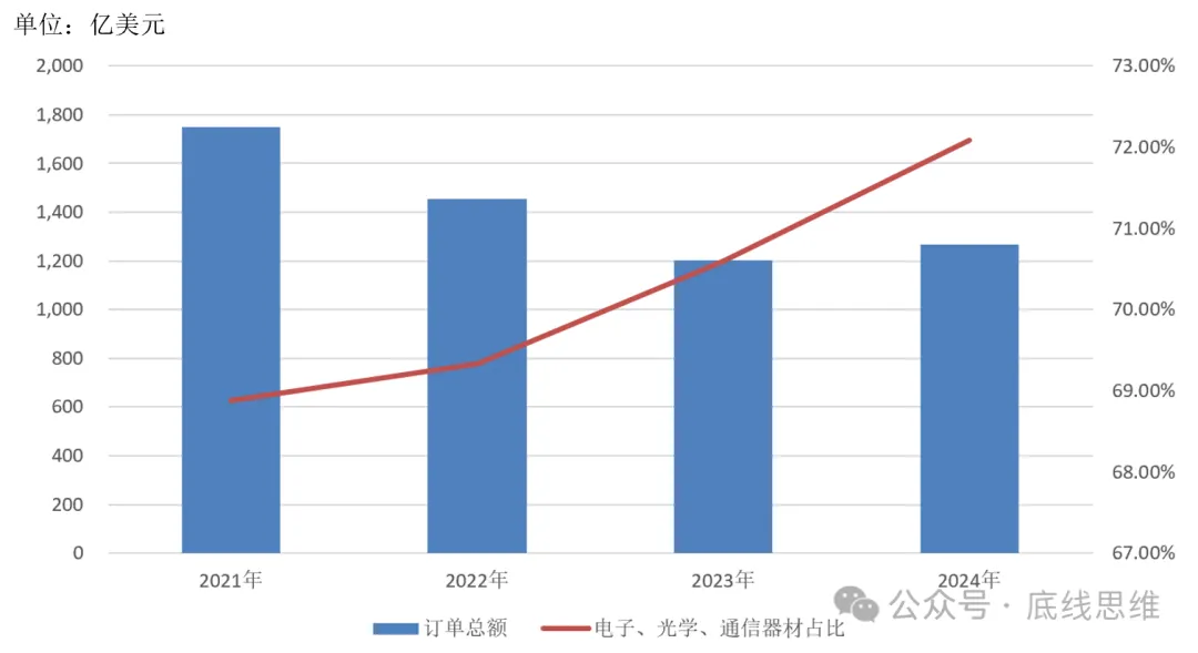 近年来台湾岛内对中国大陆的出口虽然在上升,但实际上中国大陆和中国香港地区向台湾岛内的订单金额在缩小,电子、光学、通信器材的占比还在持续扩大。数据来源:台湾经济主管部门统计处。