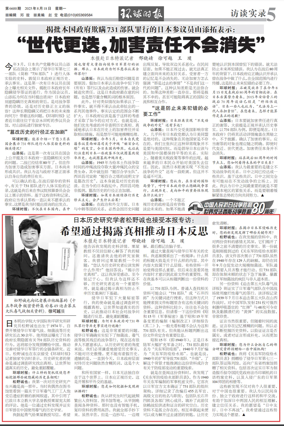 日本明治学院大学国际和平研究所研究员松野诚也出生于1974年,自费开展侵华日军毒气战、细菌战等历史研究长达30余年。他用铁证曝光了日本政府长期隐匿有关731部队历史资料的行为,还将部分发现捐赠给中国,推动完善对侵华日军罪行的全链条研究。近日,松野诚也在东京接受《环球时报》记者独家专访时表示,历史研究者的使命是通过调查研究找出真相,让世界知道真实的历史,避免重蹈覆辙。