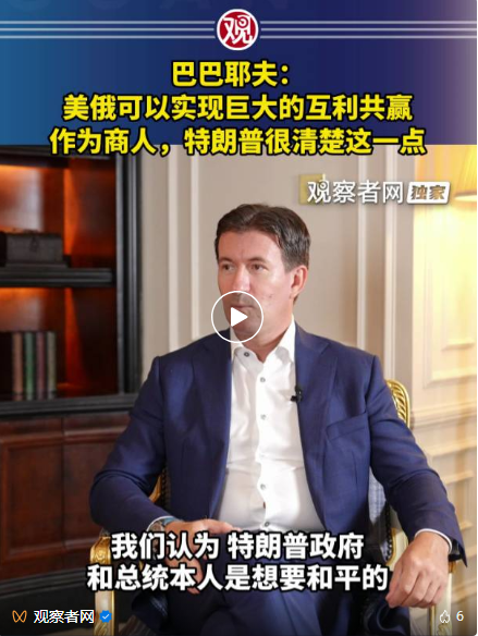 巴巴耶夫:我们认为,特朗普政府和总统本人是想要和平的;但欧洲领导人不想实现和平,他们希望把战争拖得尽可能久,因为他们被不断增长的军费和军工产业所绑架——军事预算在增长,而军工企业想要获得更多预算。这就是他们鼓吹“战斗到最后一个乌克兰人”的唯一理由。我们从欧洲方面听到的几乎都是支持继续战争的话。遗憾的是,这就是现实。