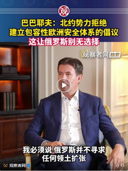 巴巴耶夫:首先,没有绝对不可谈判的条件——所有条件都可以谈,这是谈判中应展现的诚意。然而,北约绝对对俄罗斯构成威胁,这一点我们已多次指出。现任北约秘书长吕特也经常对俄罗斯做出咄咄逼人的表述。因此我们坚定主张,北约东扩不可能给欧洲带来和平,反而会威胁和平。我们坚信,为了维护和平,北约不应继续扩张。