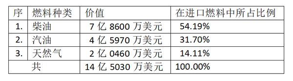 主要的三种进口燃料中,以柴油进口为最多,占所有燃料的一半以上的比例。