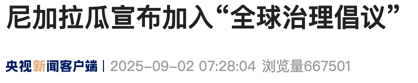 当地时间9月1日,尼加拉瓜政府发布公报,宣布将加入全球治理倡议。
