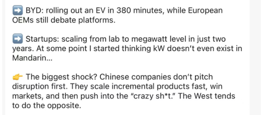 其中,来自美国的风险投资人Ashwin Shashindranath表示,这趟中国之行让他们意识到,不少西方风险投资人还活在对中国的“信息茧房”里。德国风险投资人Nick de la Forge更坦言,他在来到中国前后心态的变化是巨大的:来之前,他曾一度怀疑中国是不是真的在清洁能源领域“遥遥领先”,而在来了之后,他表示一些西方想做电池或光伏风能的初创企业,已经不在他的投资计划中了。