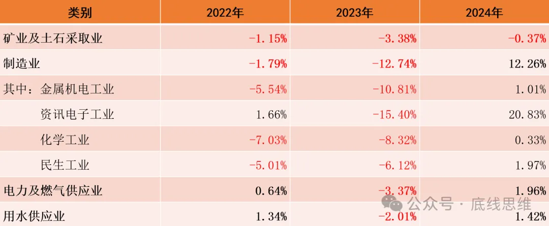 按岛内自己统计的各行业工业数据,我们更能体会到这种“一业兴、百业衰”的恐怖,除了与半导体相关的资讯电子工业,岛内其他制造业整体都处于萎缩态势。