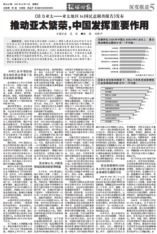 2025年亚太经合组织(APEC)领导人非正式会议计划于10月31日至11月1日在韩国举行。10月13日,在韩国首尔举行的2025中韩媒体合作论坛上,人民日报社国际部与环球时报研究院联合发布《活力亚太——亚太地区16国民意调查报告》。报告显示,APEC在推动区域合作方面取得成效、为地区发展繁荣作出贡献获民众高度认可。多数受访者认为,中国为亚太发展繁荣发挥着不可或缺的重要作用。约九成受访者认为不断深化互信、包容、合作、共赢的亚太伙伴关系对本国发展重要。民众期待各国在APEC框架下进一步深化多领域合作。