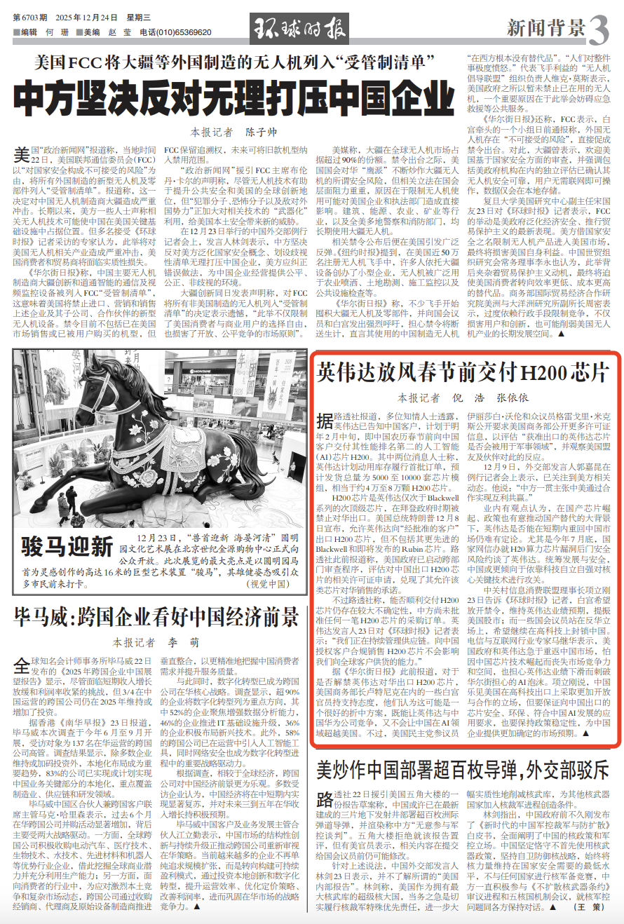 不过路透社称,能否顺利交付H200芯片仍存在较大不确定性,中方尚未批准任何一笔H200芯片的采购订单。英伟达发言人23日对《环球时报》记者表示:“我们正在持续管理供应链。向中国授权客户合规销售 H200芯片不会影响我们向全球客户供货的能力。”