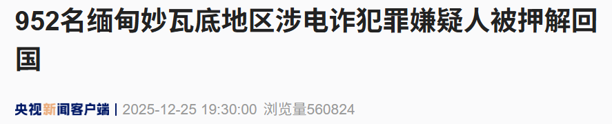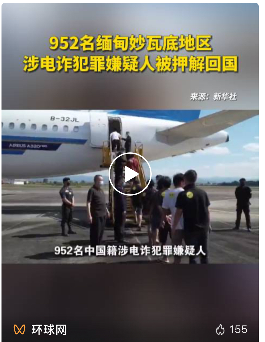 近日,公安部派出工作组会同缅甸、泰国执法部门在缅甸妙瓦底地区,联合开展新一轮赌诈园区集中清剿行动,952名中国籍涉电诈犯罪嫌疑人被押解回国……