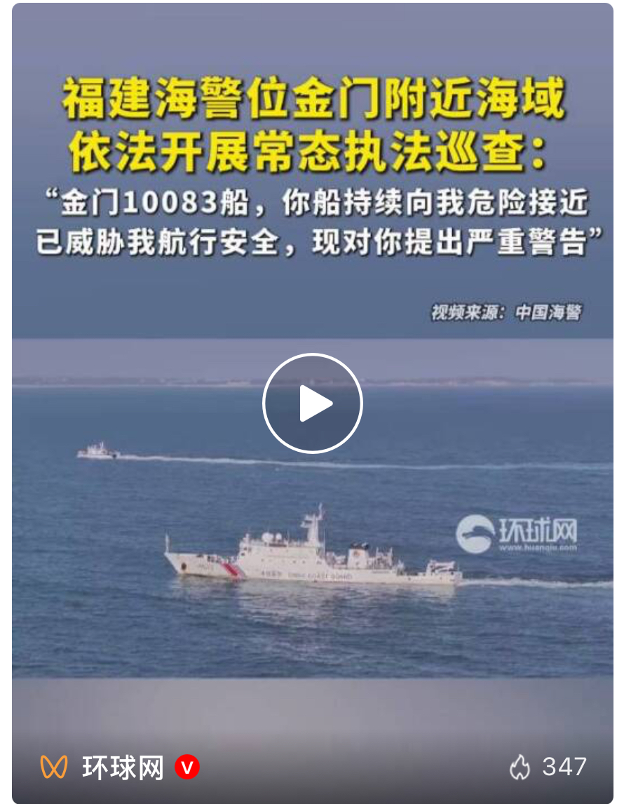 “金门10083船,你船持续向我危险接近,已威胁我航行安全,现对你提出严重警告”