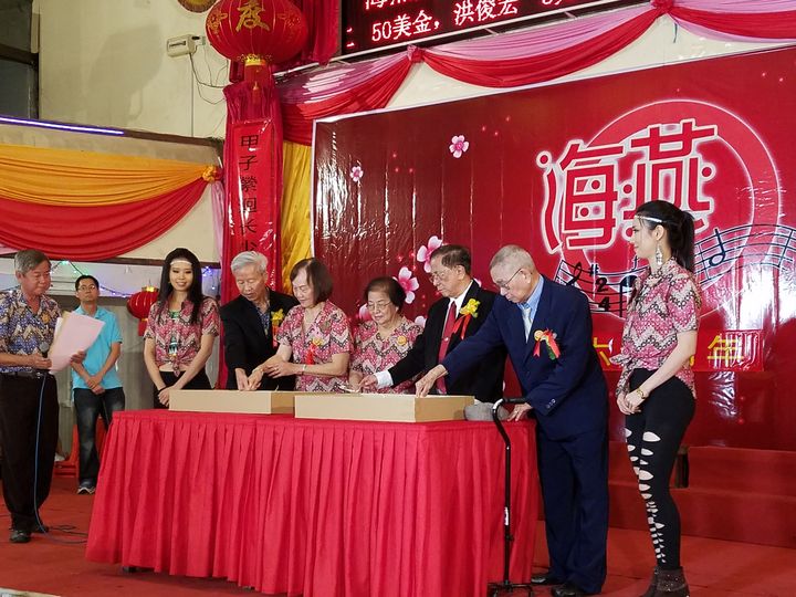 历届海燕歌咏团团长为六十周年生日切蛋糕:左起第二第三人陈祥炎团长江丽春夫妇,右二苏松福团长、右起第三第四人黄庆燕团长庄素美夫妇