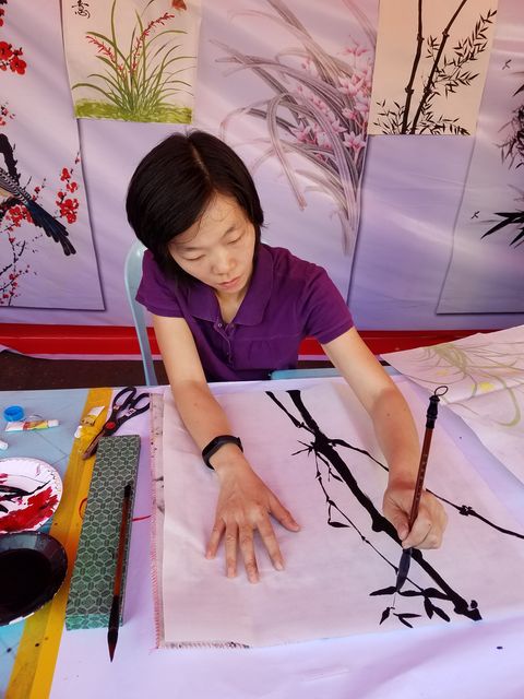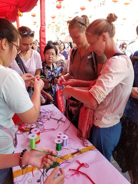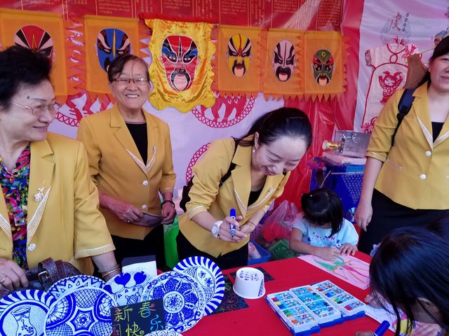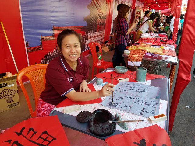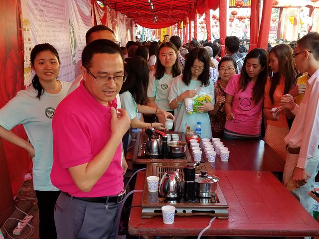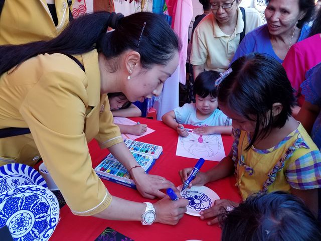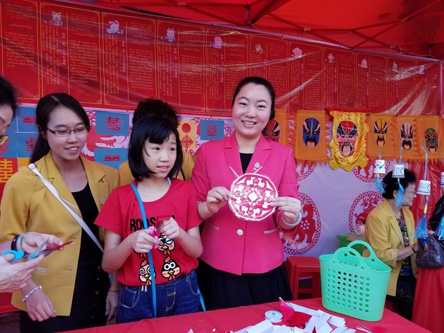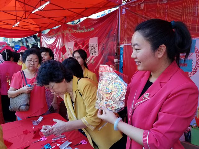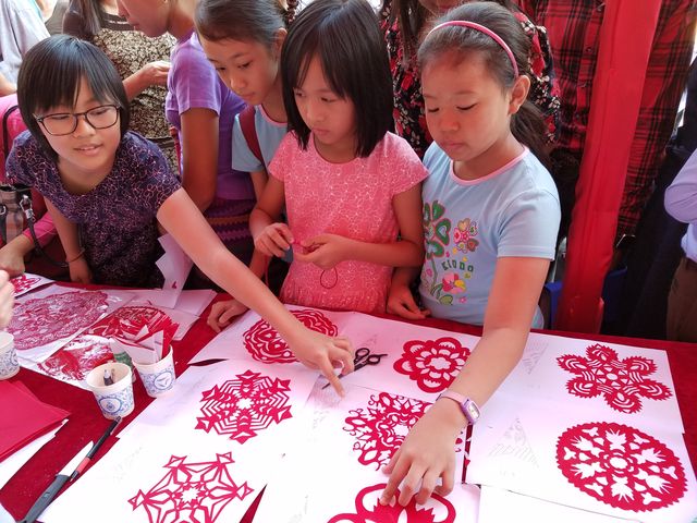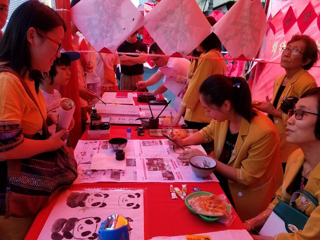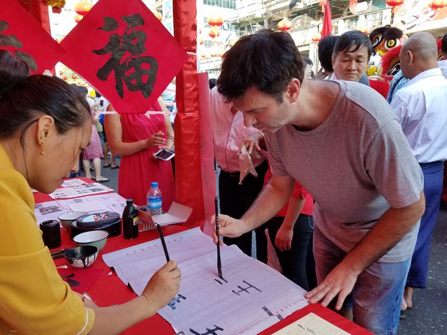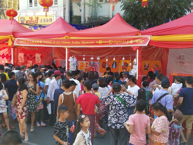 西起南勃陶街,东至大金塔路,道上挂满一排排红灯笼,将唐人街点缀成一条火红的长龙;街道旁一排排彩棚吸引了不同肤色的观众,有缅甸人、华人和印人,还有到缅甸旅游的老外,原来各华校的老师们正在表演剪纸,书法、绘画、茶艺、中国结等技艺,并身教言传,来宾们和小朋友们亲身感受到中华文化的魅力!老师们虽然辛苦了一天,但她们的心里却是美滋滋的,因为她们是中华文化的传播人,也是中缅友谊的使者!
