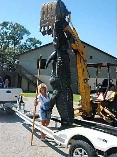 她只有5英尺5英寸高(约合1.64米),体重也只有115镑(约52公斤),而它却有13英尺长(约4米),体重达到了1025镑(约465公 斤)。2010年9月,在南卡罗来纳州摩尔特里湖中,48岁的玛拉?克里斯蒂安与这条巨大无比的可怕生物争斗了两个小时。22毫米口径的猎枪根本无法制服 它,玛拉就用锋利的尖刀切断了野兽的脊柱。最终,她终于可以在起吊机前细细打量这条令人难以置信的鳄鱼。