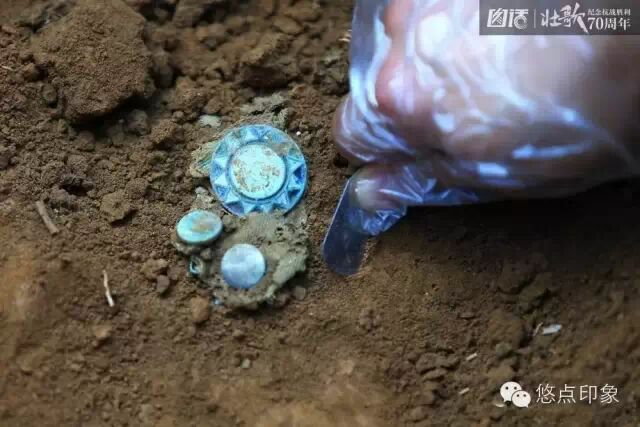 4月10日下午,在第一个墓穴中挖掘出保存完好的青天白日帽徽和铜帽扣,证明此处确实为埋葬中国远征军牺牲将士的墓地。