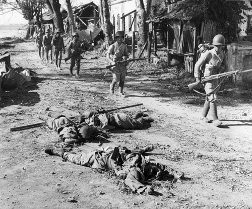 据日方统计,日军在缅甸战场的阵亡官兵约为13.7万,由于日本战败,留下大量未能及时处理的弃尸。图为1944年12月,缅甸北部城市八莫,中国远征军士兵途经被击毙的日军尸体。
