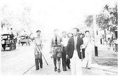 缅甸华侨青年组织战时工作队。图为工作队高举队旗在曼德勒市街头宣传抗日。走在队伍前面的是著名诗人张光年(光未然)
