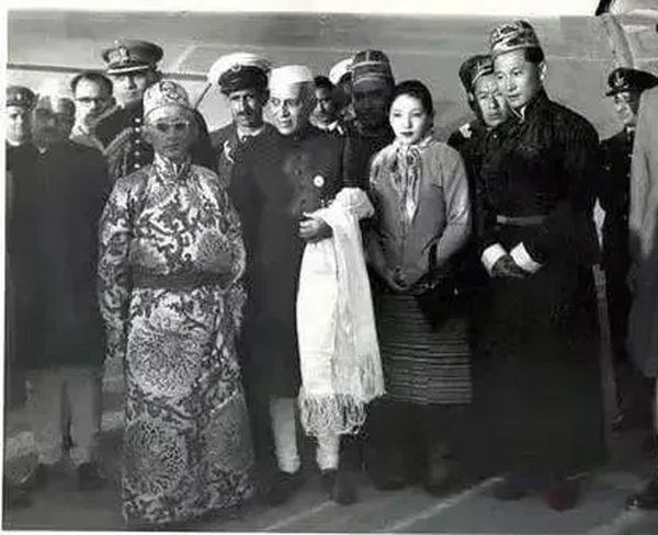 上世纪五十年代,印度总理尼赫鲁(手拿哈达者)与锡金王室。戴丝巾者为顿珠南嘉妻子桑颇·桑吉德西