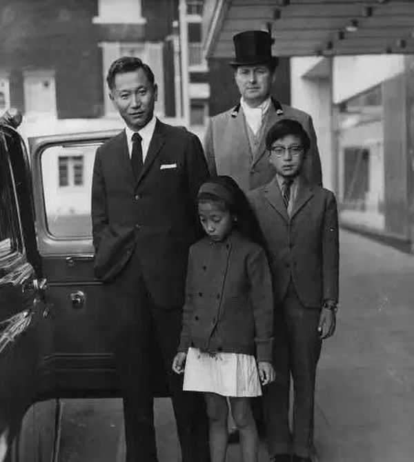 1964年锡金国王(左一)访问伦敦,照片上的两个孩子是他与原配妻子桑颇所生,即才旺仁增少将的两个外孙