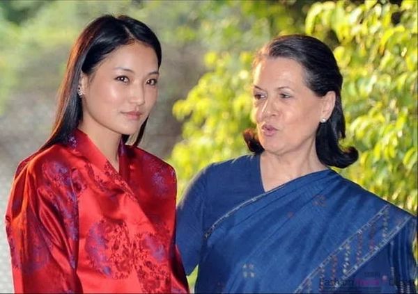 不丹王后(左)与印度国大党领导人索尼娅。索尼娅是印度前总理尼赫鲁的外孙媳妇、前总理英迪拉·甘地的儿媳、前总理拉吉夫·甘地的遗孀。婆婆英迪拉执政期间,印度吞并了锡金。