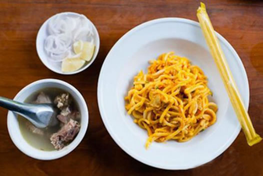 缅甸人喜爱“干”面小吃——从本质上来说其实是用面做的沙拉,配上肉汤——而其中最甘旨最遍及的一种即是nangyi thoke。这种小吃用鸡肉、切成片的鱼饼、豆芽和卤鸡蛋配上米线,十分好吃。质料中加上烘焙的鹰嘴豆粉、姜黄粉和辣椒油,将这些配料摇匀,再加上腌菜和一碗肉汤,就功德圆满了。
