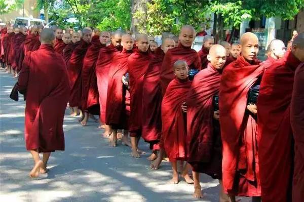 而在缅甸最大的佛学院——伽纳杨佛学院,目前有不同年龄的僧侣近1500人。每天上午10:15,僧侣就餐时,1500多名僧侣不断从宿舍走出来,非常安静地在马路上排队,到餐厅的院子内领取饭菜、汤及水果,再进入餐厅就餐,场面十分壮观。