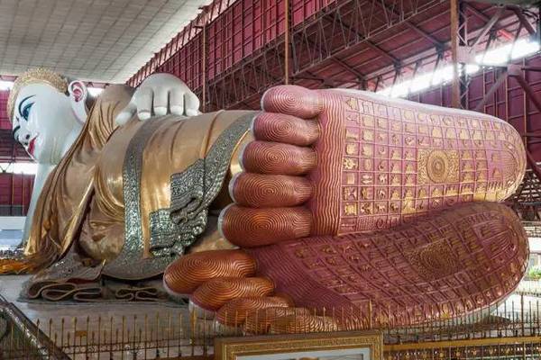 曹太极塔ChaukhtatKyi Paya有一尊巨大的卧佛,这尊佛像有着悠久的历史,最值得一看的是他的脚底有108个图案,代表着108次轮回。
