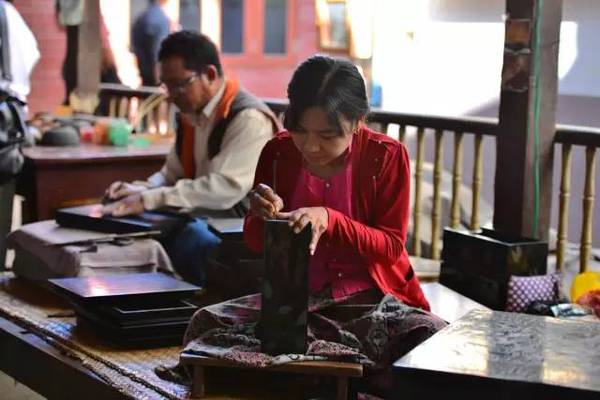 蒲甘传统的手工艺品——漆器的制作。严格的说起来,制作漆器品的工作程序,前前后后一共有十八个步骤。有趣的是,其中一个步骤,需要涂一层牛粪和黑漆树脂混合成的灰泥。