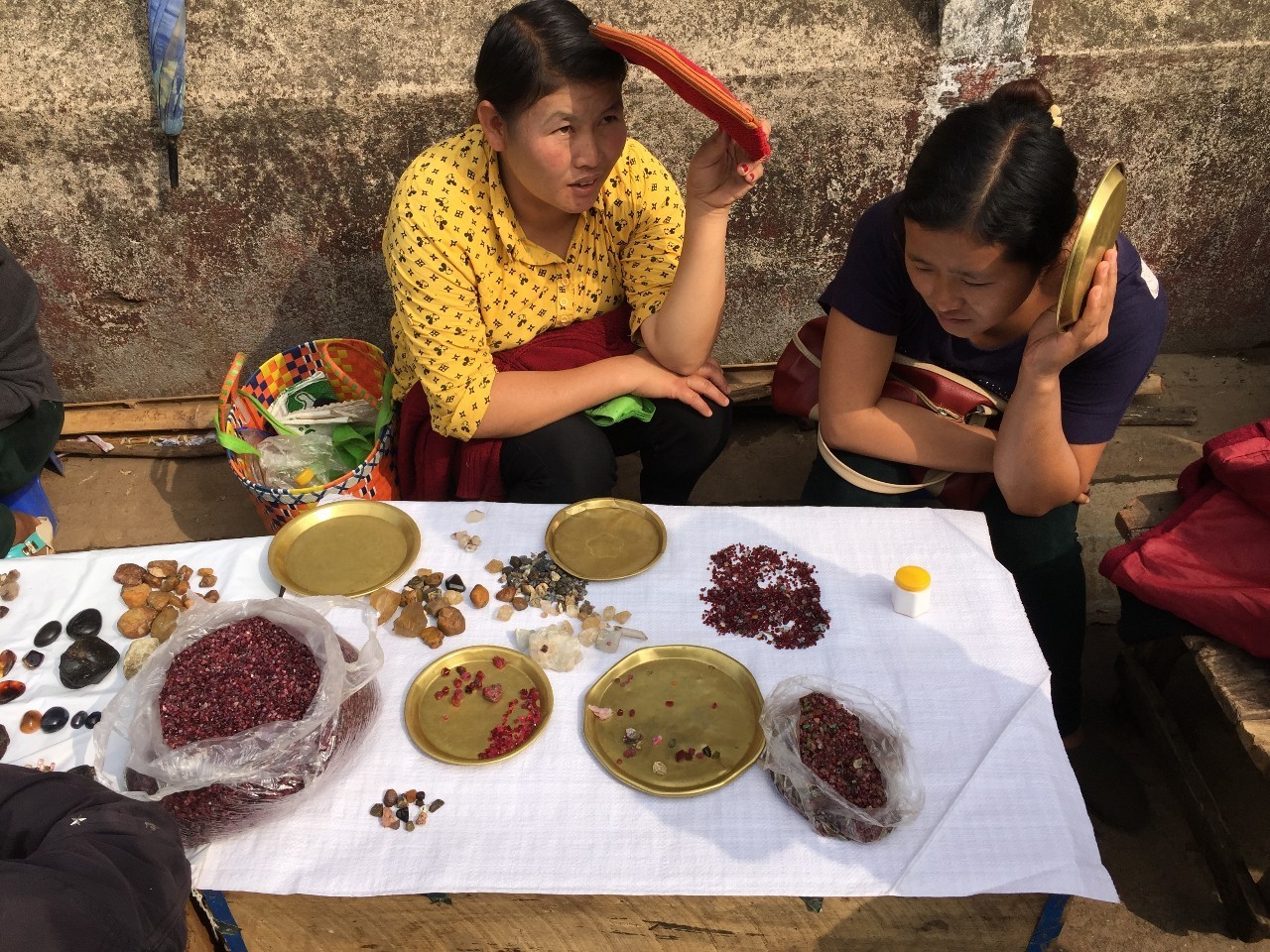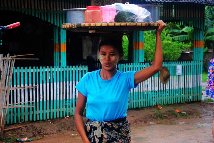 每天早晨,大街小巷,有许多女性小贩,头顶箩筐,挨家挨户送卖早点,有蒸豆、糯米饭、黑糯米;上午,又有其他妇女小贩,再次头顶箩筐挨家挨户卖菜,有猪肉、鱼肉、鸡肉、蔬菜,样样齐全;下午,还有另外一些小贩,头顶箩筐,叫卖下午点心,有缅式米线、鱼汤米粉、各种凉拌等。